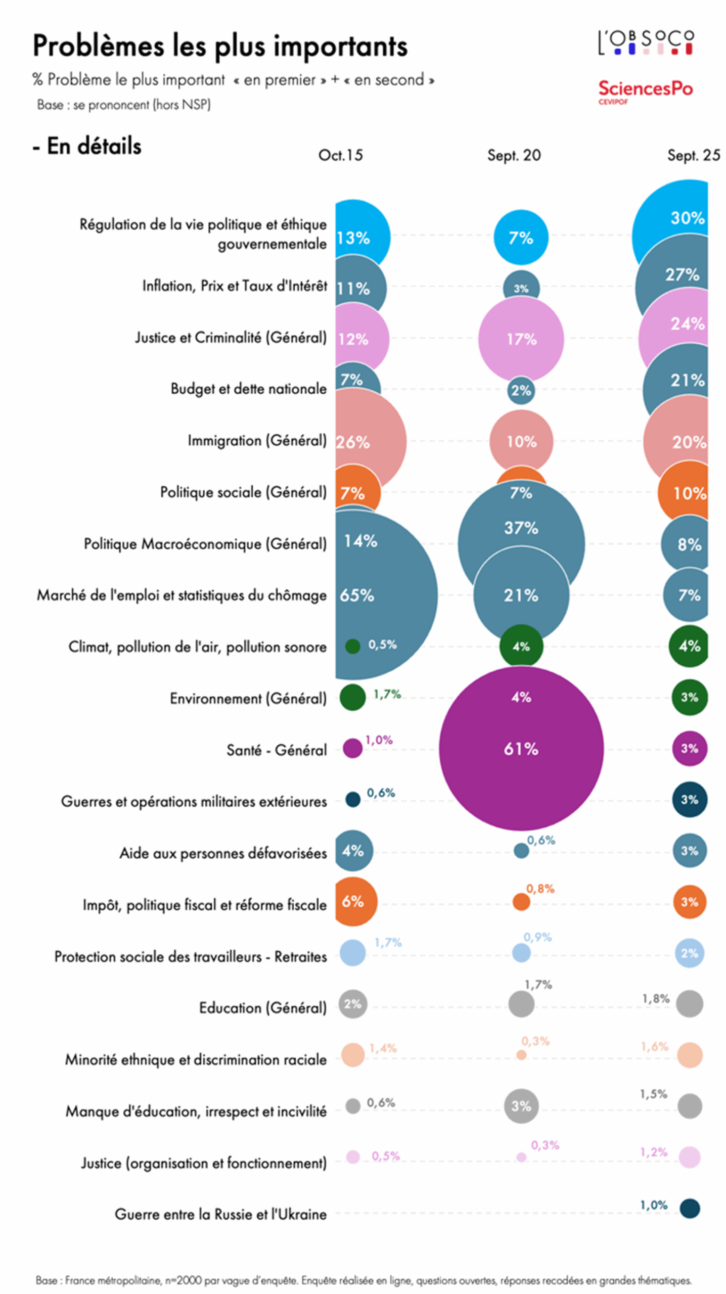 Ce dispositif renoue avec la méthodologie du « Most Important Problem » (MIP), éprouvée internationalement et poursuit le suivi initié par le « baromètre des priorités politiques » du CEVIPOF (2014-2020). Cette approche permet de capter la voix citoyenne dans sa spontanéité, sans liste prédéfinie ni suggestion ou cadrage. L’ObSoCo et le CEVIPOF reprennent cette méthodologie et vont, chaque trimestre, interroger 2000 personnes, les archives du CEVIPOF offrant au dispositif une profondeur historique précieuse.